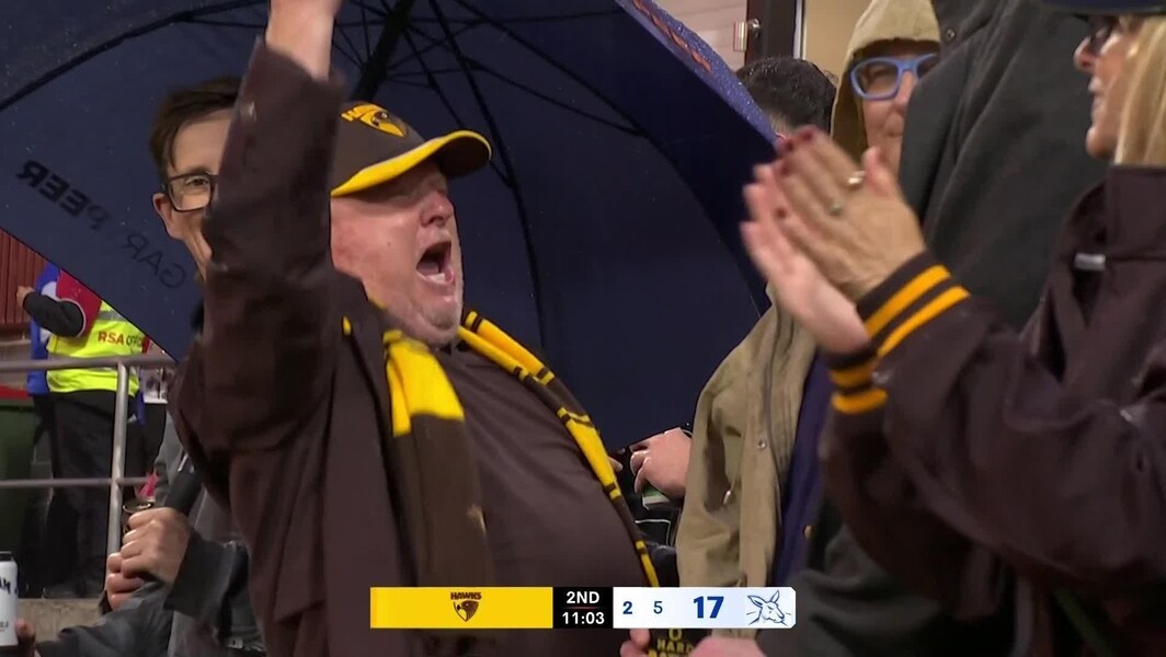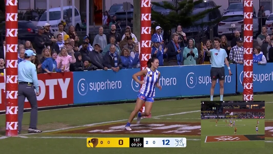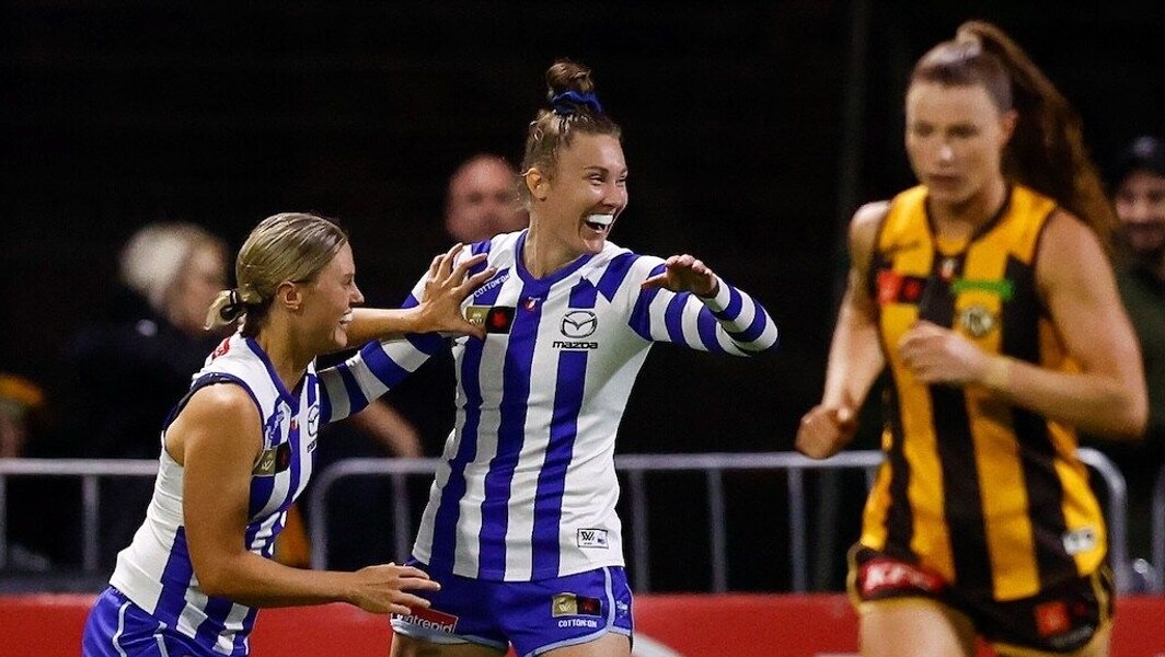 But a classy snap from North Melbourne small forward Bella Eddey released the pressure valve and broke the flow of play, giving the Roos some breathing room again, before winger Tess Craven pounced on a Hawthorn error to give the Roos a 22-point lead heading into the main change.