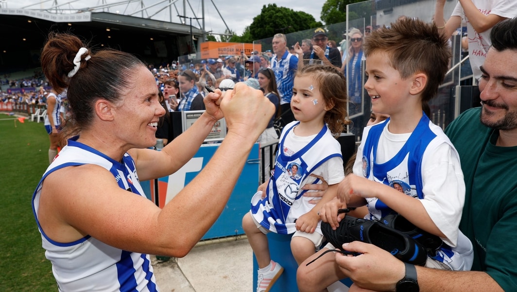 “So here I am, 36, still playing. I understand why she was still playing. It’s such a great game, I love it. And it certainly helps, playing in a team like North, where I don’t feel like I have to do anything remarkable in how I play. I can just sort of play my role off half-back, and use my experience to help out our younger players.