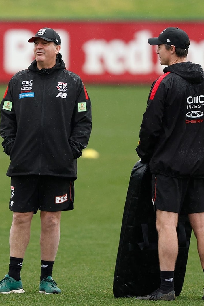 Ross Lyon and Lenny Hayes at a St Kilda training sessions in 2024. Picture: AFL Photos
