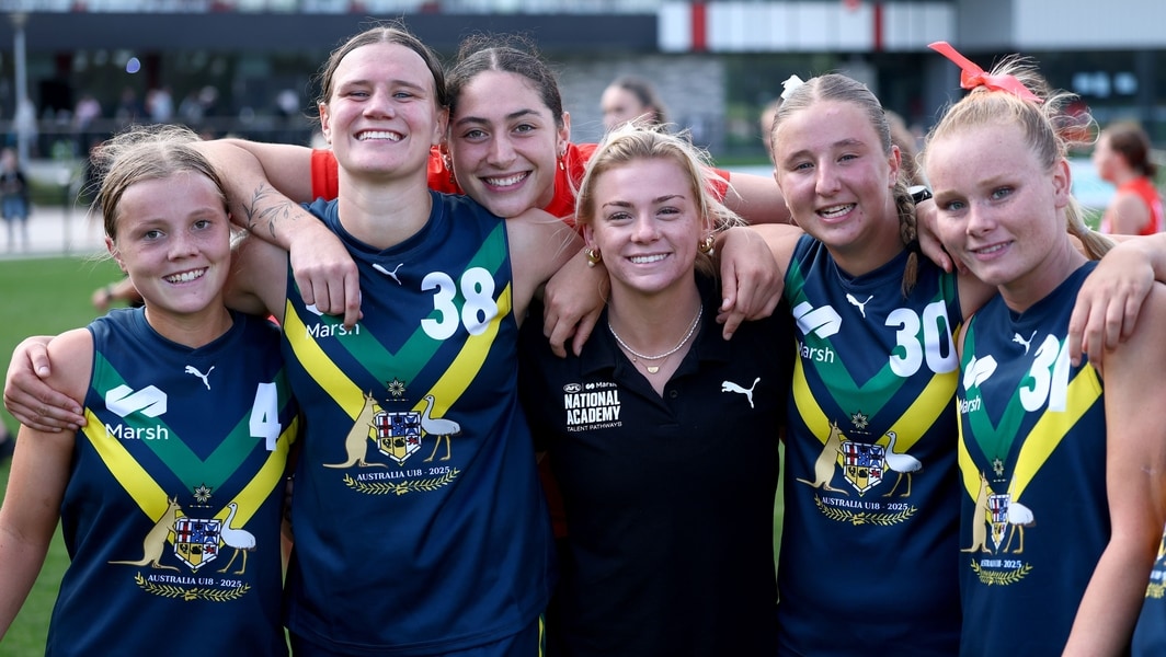 Chloe Baker-West, Olivia Wolmarans, Dekota Baron, Ava Usher, Ella Stoddart andAlannah Welsh pose following the Marsh AFL National Academy match at RSEA Park, April 20, 2025. Picture: AFL Photos