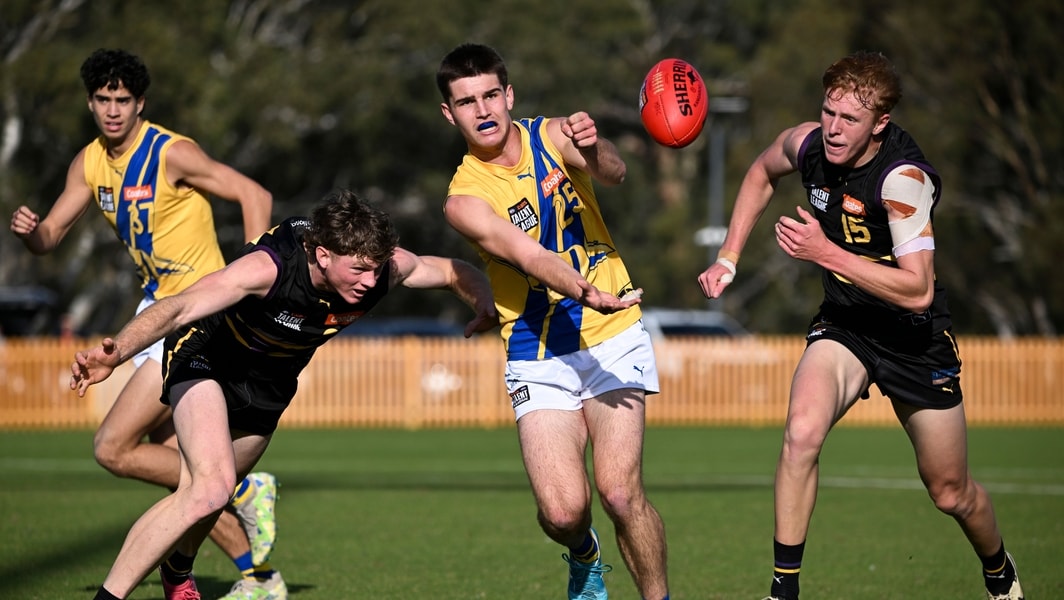 Oskar Ainsworth in action during Western Jets’ clash with Murray Bushrangers in the 2025 Coates Talent League. Picture: AFL Photos