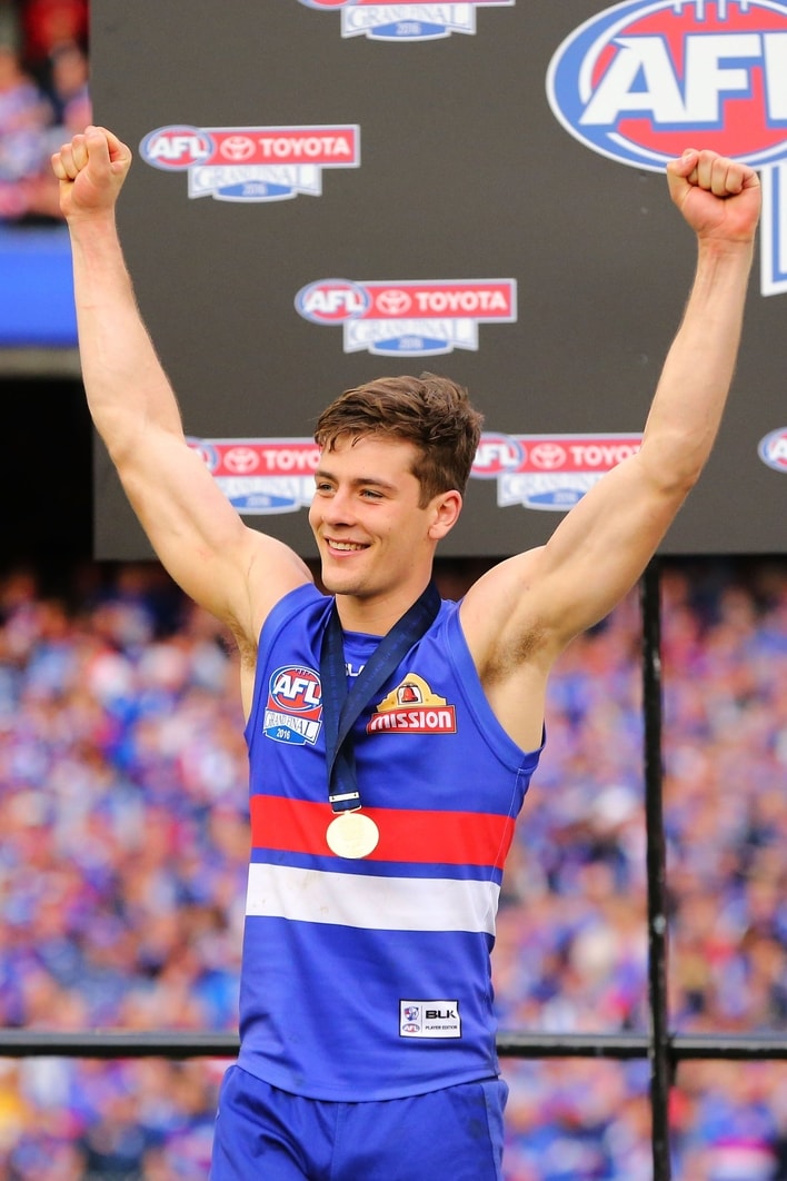 Josh Dunkley celebrates the Western Bulldogs’ win over Sydney in the 2016 Grand Final. Picture: AFL Photos