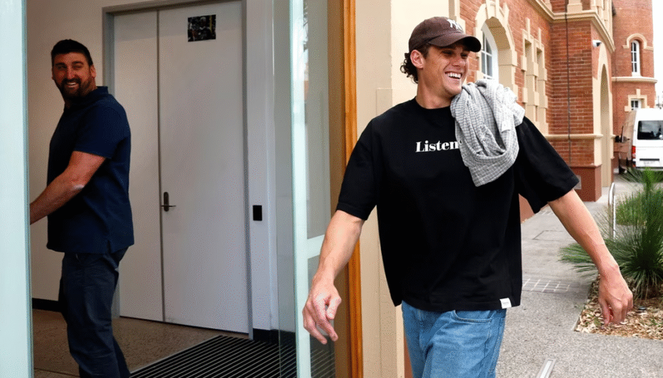 Carlton star Charlie Curnow arrives at the Swans’ HQ on October 13, 2025, with Sydney coach Dean Cox (left) seen. Picture: Phil Hillyard