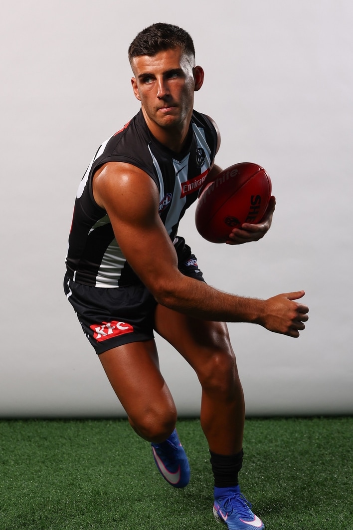 Nick Daicos poses during Collingwood’s 2026 team photo day at the KGM Centre. Picture: AFL Photos