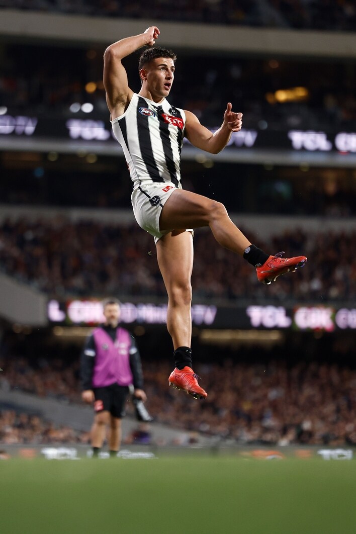Harvey Harrison celebrates a goal during the round 17 match between Collingwood and Essendon at the Melbourne Cricket Ground, on July 5, 2024. Picture: Getty Images/AFL Photos