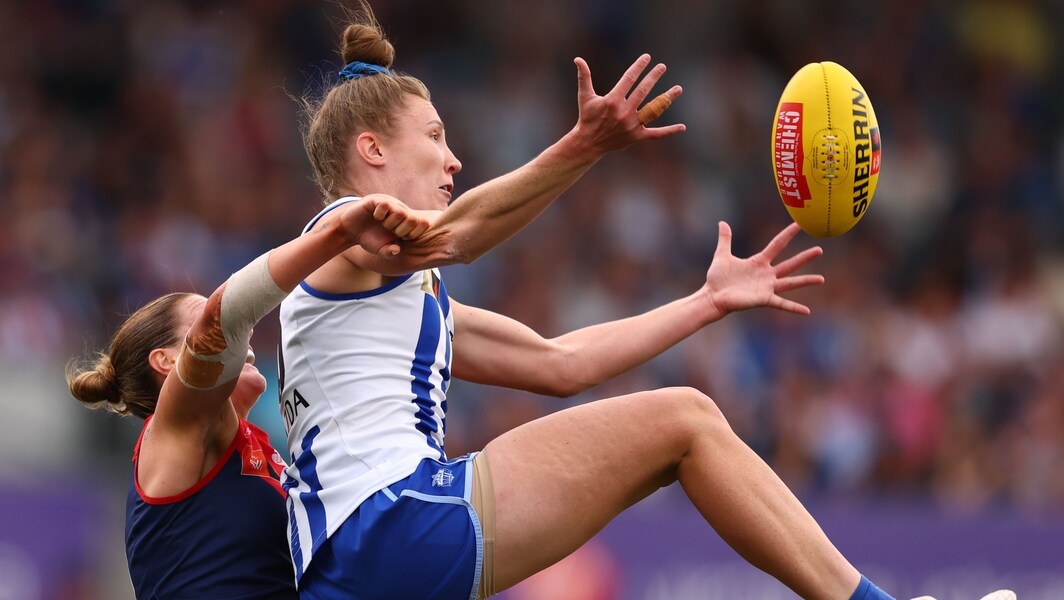 Tahlia Randall attempts to mark during North Melbourne’s preliminary final against Melbourne on November 22, 2025. Picture: Getty Images