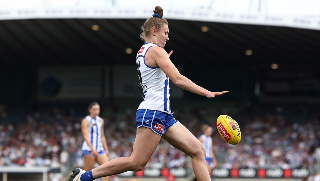 Tahlia Randall kicks the ball during North Melbourne’s preliminary final against Melbourne on November 22, 2025. Picture: AFL Photos