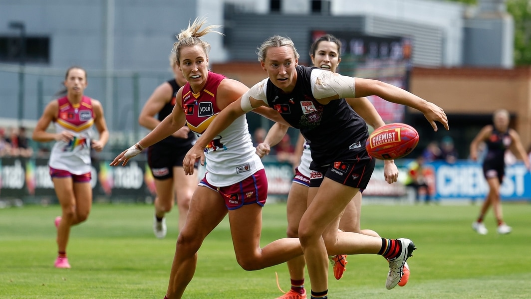 Nat Grider and Sophie Alexander in action during Brisbane’s clash against Essendon in round 10, 2025. Picture: AFL Photos
