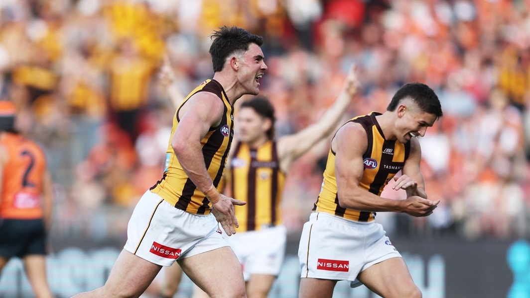 Jai Newcombe celebrates during the Elimination Final between Greater Western Sydney and Hawthorn at ENGIE Stadium, September 6, 2025. Picture: AFL Photos