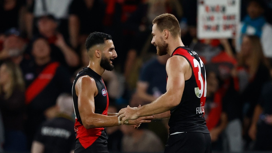 Saad El-Hawli and Ben McKay celebrate during Essendon’s clash against Port Adelaide in round three, 2025. Picture: AFL Photos