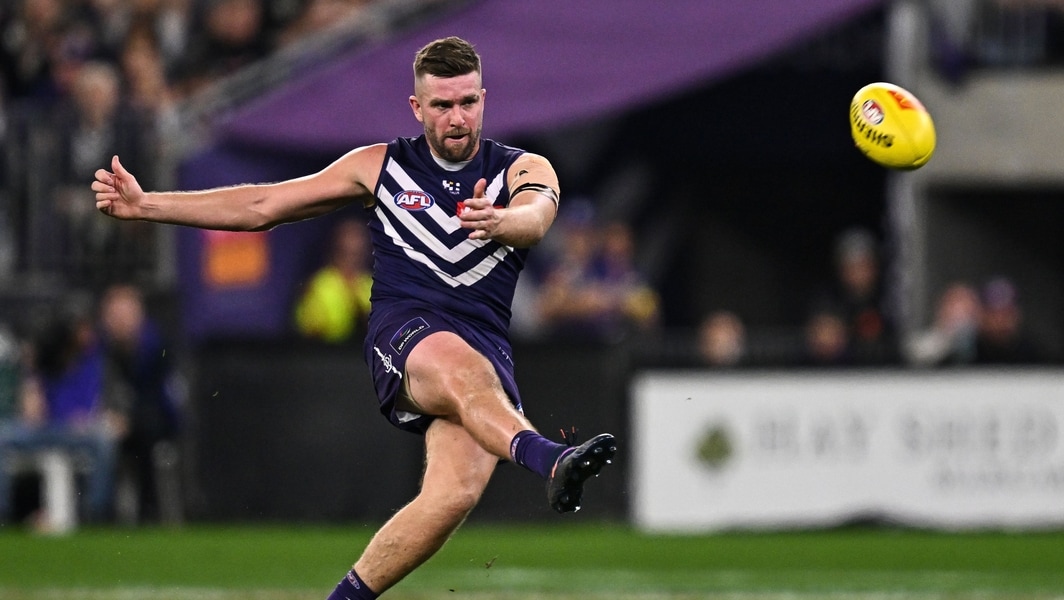 Luke Ryan kicks the ball during Fremantle’s clash against Collingwood in round nine, 2025. Picture: AFL Photos