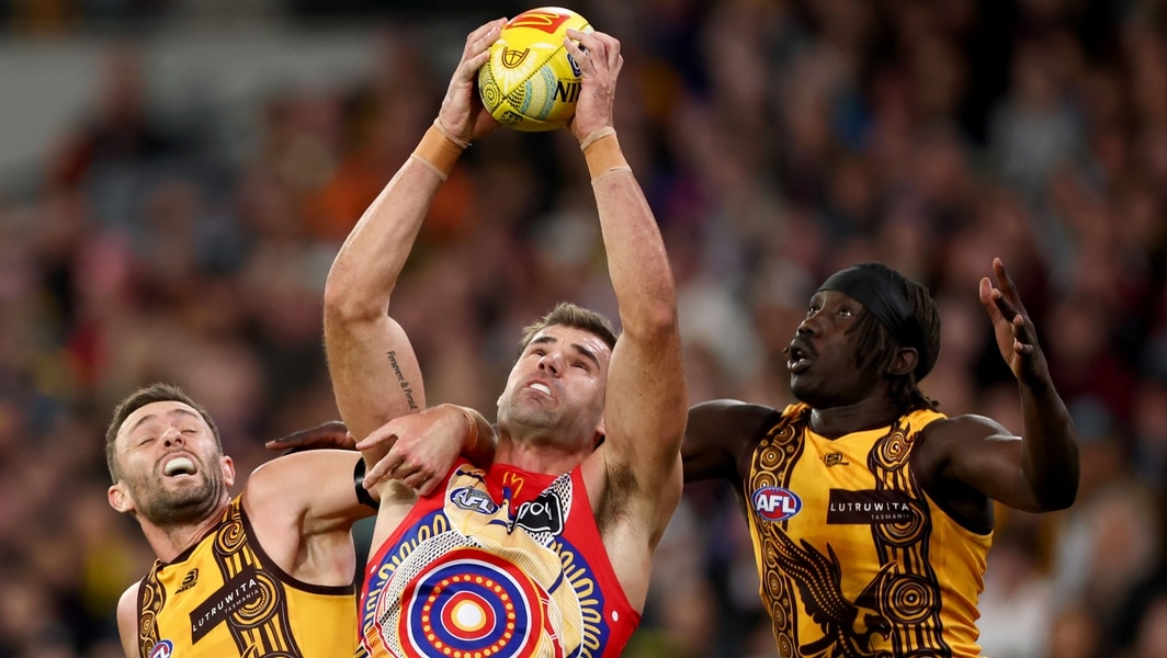 Tom Barrass marks the ball during Hawthorn’s clash against Carlton in round 20, 2025. Picture: Getty Images