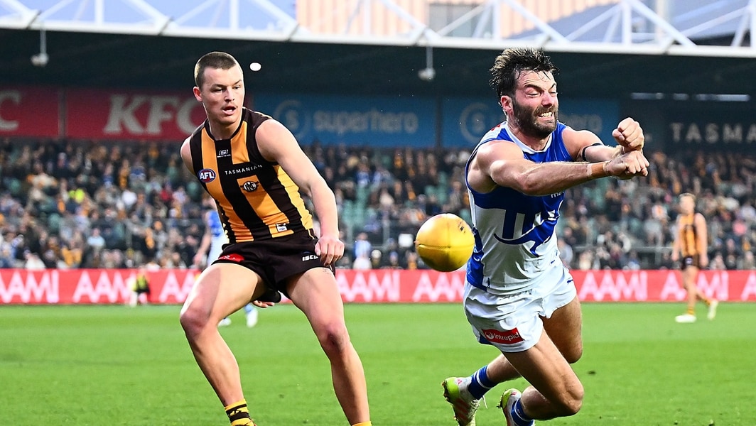 Luke McDonald spoils the ball during the R16 match between North Melbourne and Hawthorn at University of Tasmania Stadium on June 28, 2025. Picture: Getty Images/AFL Photos