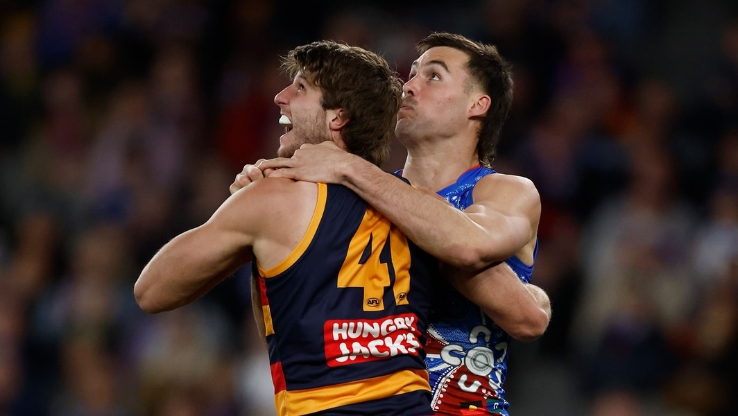 Jordon Butts and Sam Darcy compete for the ball during the Western Bulldogs’ clash against Adelaide in round 18, 2025. Picture: AFL Photos