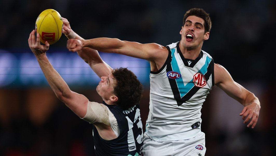 Blake Acres and Brandon Zerk-Thatcher compete for the ball during Carlton’s clash against Port Adelaide in round 23, 2025. Picture: Getty Images