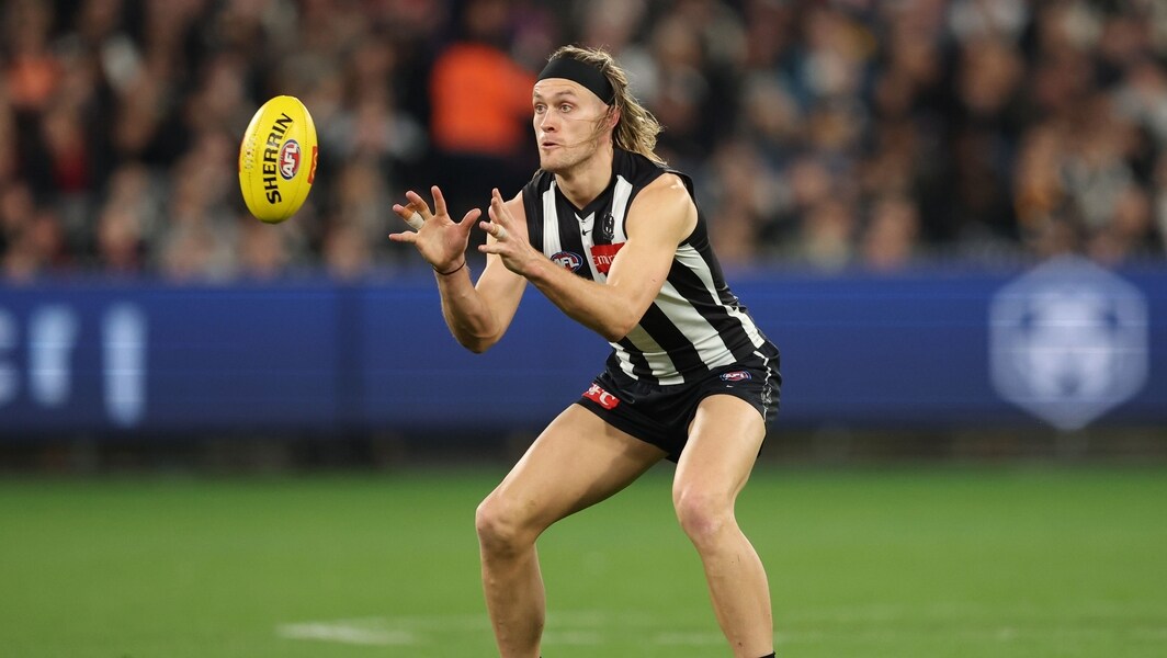 Darcy Moore marks the ball during the match between Collingwood and Melbourne at the MCG in round 24, 2025. Picture: Getty Images
