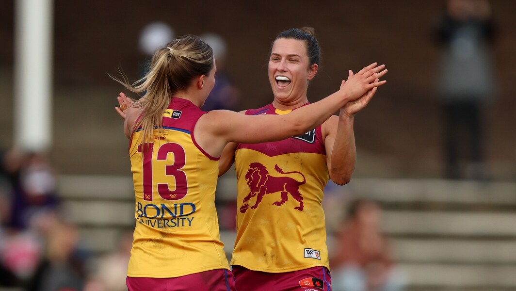 Cathy Svarc celebrates a goal during the AFLW R2 match between Brisbane and Fremantle at Fremantle Oval on August 23, 2025. Picture: AFL Photos