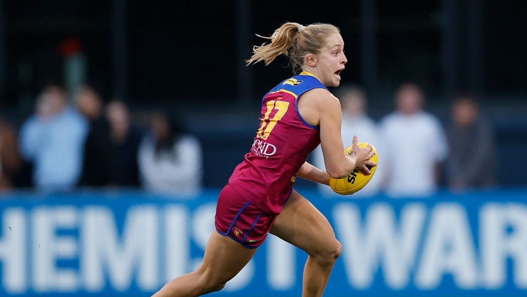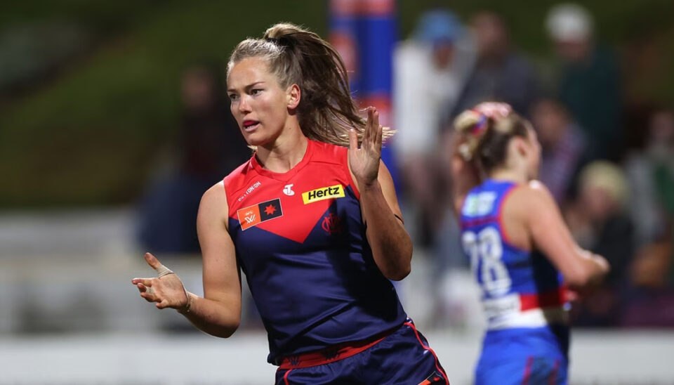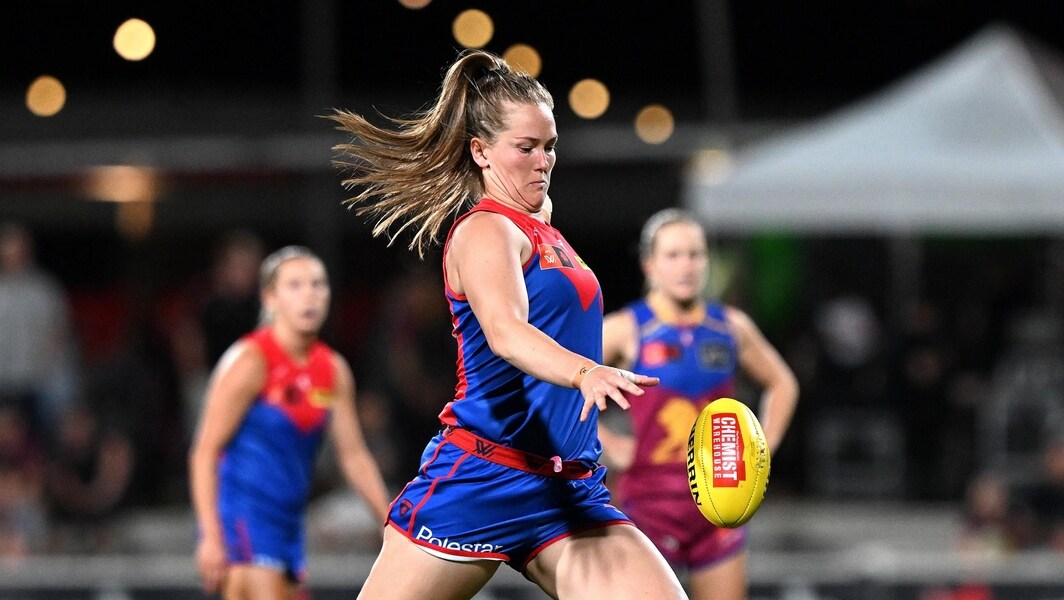 Eden Zanker in action during Melbourne’s clash with Brisbane in AFLW round 11, 2025. Picture: AFL Photos