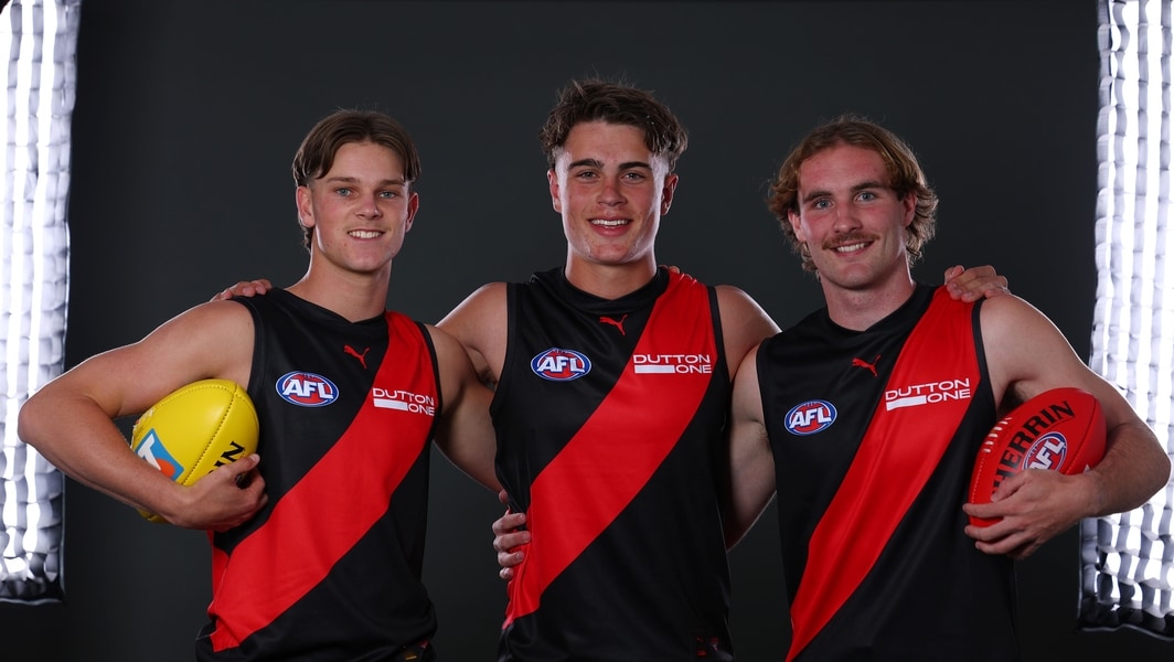 Jacob Farrow, Sullivan Robey and Dyson Sharp after being drafted by Essendon at the 2025 Telstra AFL Draft. Picture: AFL Photos