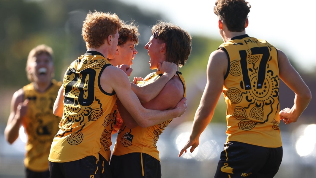 Fred Rodriguez celebrates a goal during Western Australia’s Marsh AFL National Under-18 Boys Championships clash against Vic Country on June 7, 2025. Picture: AFL Photos