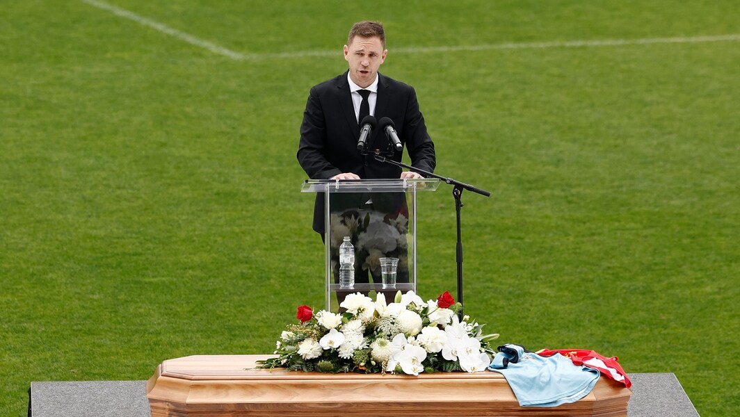 Joel Selwood delivers his eulogy during Troy Selwood’s funeral service at GMHBA Stadium on February 14, 2025. Picture: AFL Photos