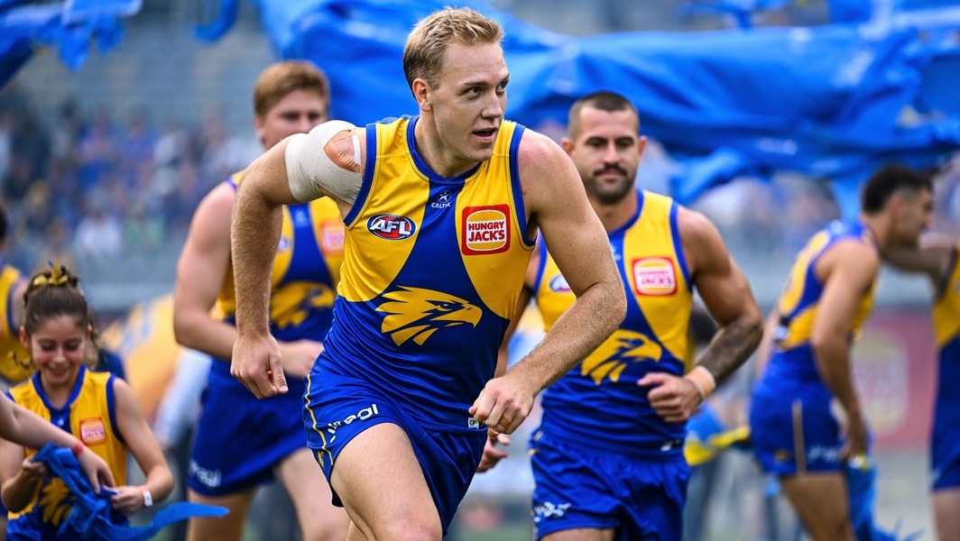 Oscar Allen leads West Coast out against Fremantle in round three, 2025. Picture: AFL Photos