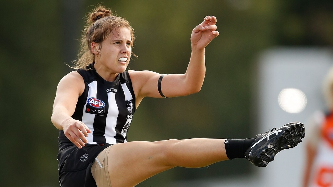Jasmine Garner kicks the ball during the AFLW R3 match between Collingwood and GWS at Olympic Park Oval on February 18, 2018. Picture: AFL Photos