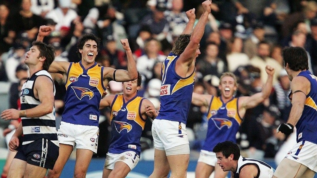 In an absolute classic, the Eagles claimed one of their best ever home and away wins, and their biggest comeback victory, against the Cats in Geelong in 2006. The Cats led by nine goals midway through the third quarter and looked on track for a huge victory. But the Eagles kicked nine of the next 11 goals with Daniel Kerr giving them the lead before Nathan Ablett restored Geelong’s advantage. But Adam Hunter, earlier pushed head first into the dugout, kicked the matchwinner late for a famous West Coast win.