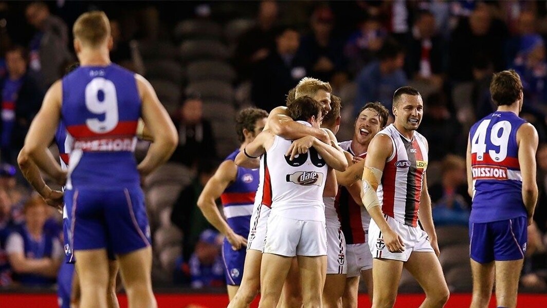 The Saints’ equal biggest comeback win came against the Bulldogs in 2015. When Jake Stringer kicked his fourth goal early in the third quarter, the Dogs led by 55 points. St Kilda closed the gap to two goals by three-quarter time, but the Bulldogs were back ahead by 25 after two early goals in the last. But three final-quarter goals from Jack Billings lifted the Saints to an unlikely win.