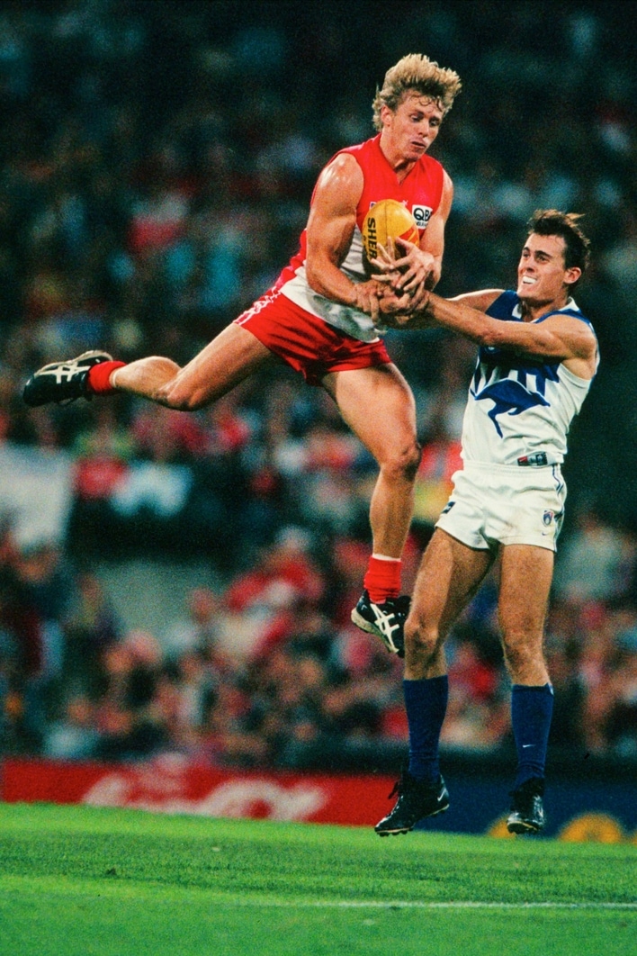 Stuart Maxfield leaps for a mark during Sydney’s clash against North Melbourne in round four, 1999. Picture: AFL Photos