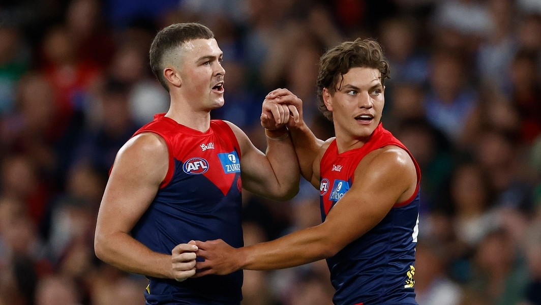 Daniel Turner and Taj Woewodin celebrate a goal during Melbourne’s clash against North Melbourne in round two, 2025. Picture: AFL Photos