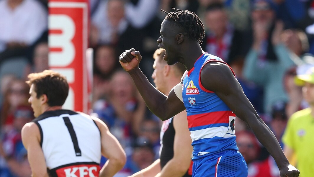 Buku Khamis celebrates a goal during the Western Bulldogs’ clash against Port Adelaide in round eight, 2025. Picture: Getty Images