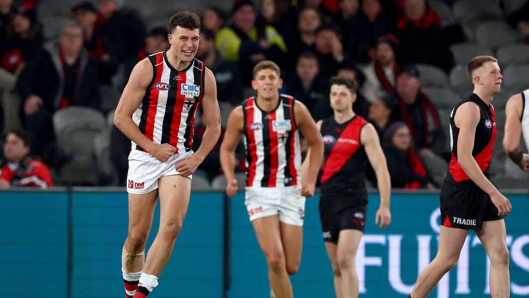 Rowan Marshall celebrates a goal during the R23 match between St Kilda and Essendon at Marvel Stadium on August 15, 2025. Picture: Getty Images/AFL Photos