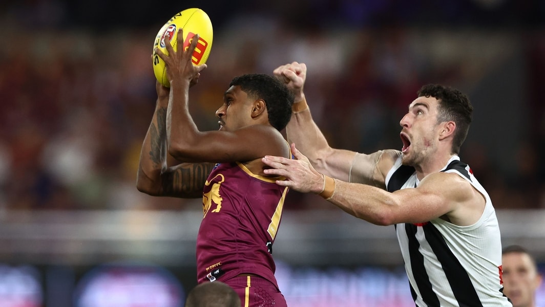 Keidean Coleman marks the ball during the match between Brisbane and Collingwood at the Gabba in round four, 2026. Picture: AFL Photos