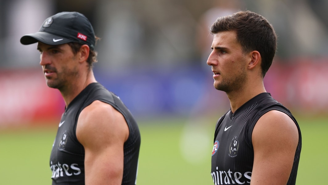 Scott Pendlebury and Nick Daicos chat during a Collingwood training session at Olympic Park Oval on April 8, 2026. Picture: Getty Images/AFL Photos