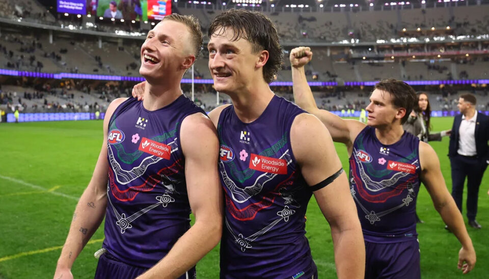 Josh Treacy and Alex Pearce celebrate a goal during the round 23 match between Fremantle and Brisbane at Optus Stadium on August 15, 2025. Picture: AFL Photos