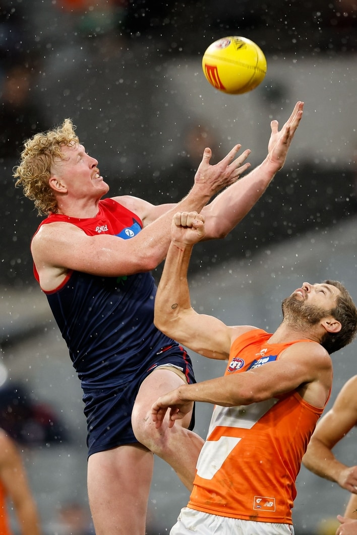 Clayton Oliver and Callan Ward compete for the ball during the R1 match between Melbourne and GWS at the Melbourne Cricket Ground on March 16, 2025. Picture: AFL Photos