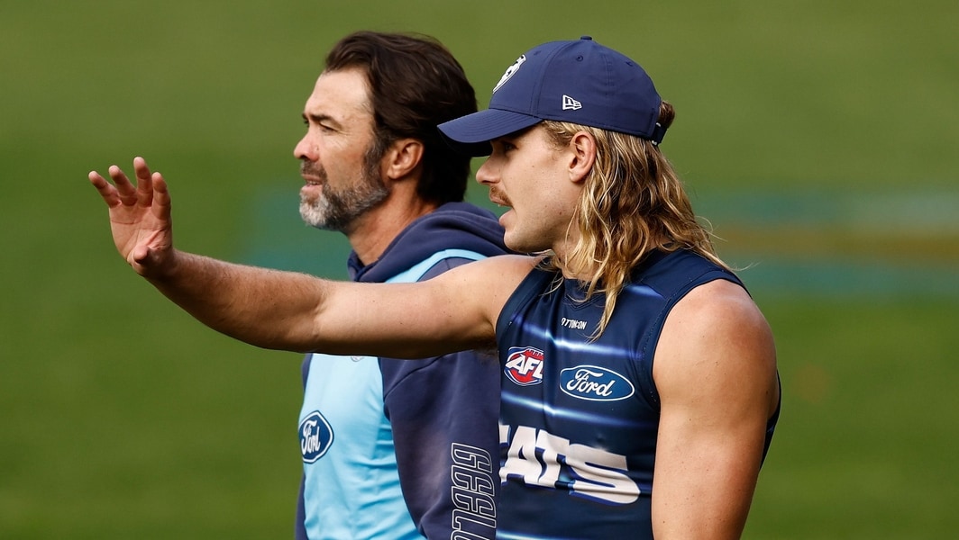 Chris Scott and Bailey Smith chat during Geelong’s training session at GMHBA Stadium on May 15, 2025. Picture: AFL Photos