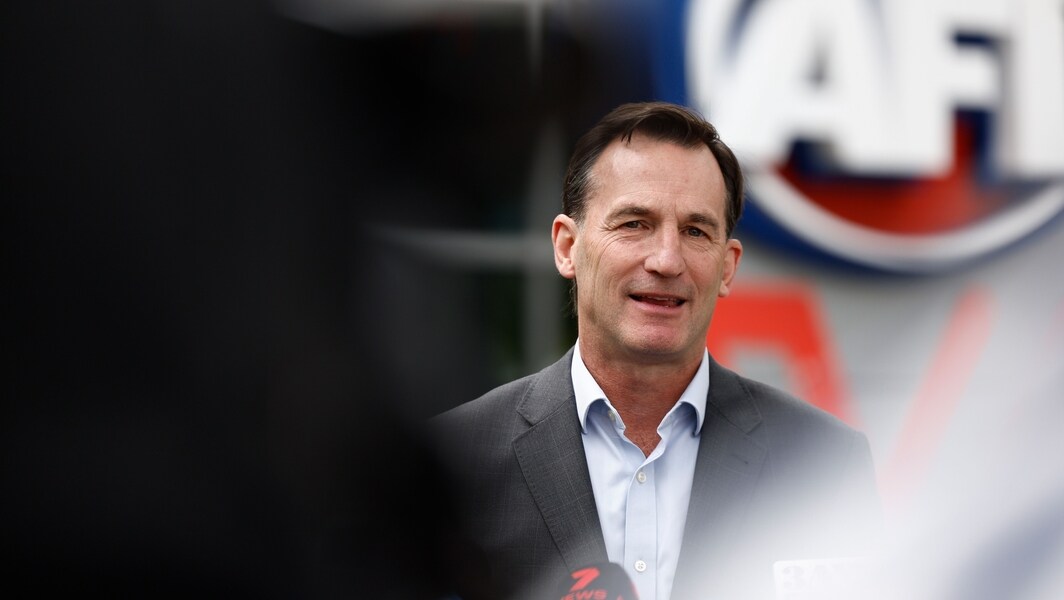 Andrew Dillon speaks with media at AFL House on November 10, 2025. Picture: AFL Photos