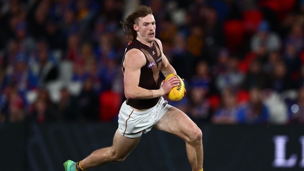 Josh Weddle runs with the ball during the round 13 match between Hawthorn and the Western Bulldogs at Marvel Stadium on June 5, 2025. Picture: AFL Photos