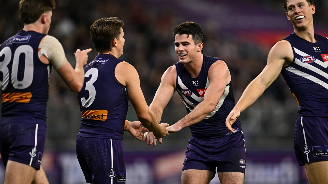 Caleb Serong and Andrew Brayshaw celebrate a goal during Fremantle’s clash against Essendon in round 15, 2025. Picture: AFL Photos