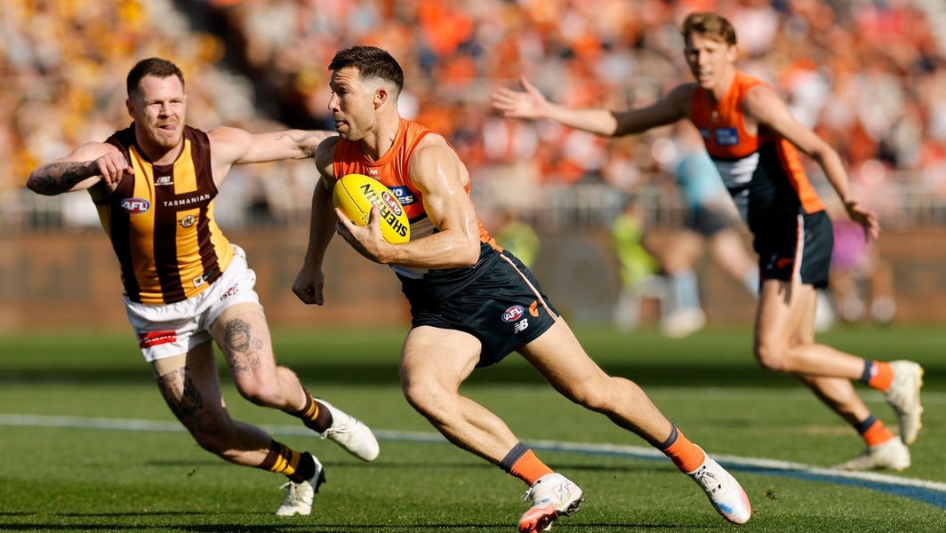 Toby Greene runs with the ball during Greater Western Sydney’s elimination final against Hawthorn on September 6, 2025. Picture: Getty Images