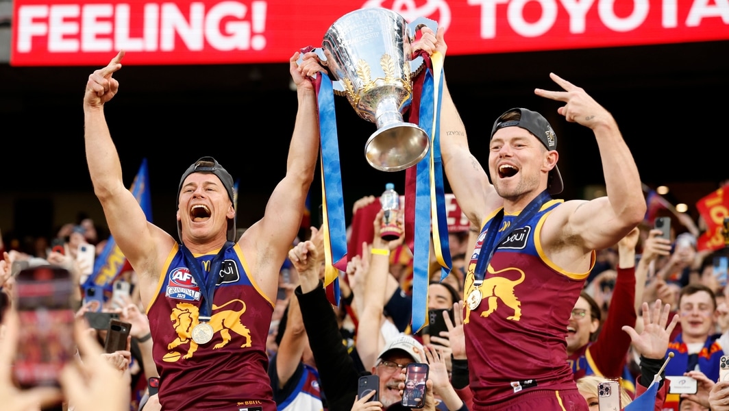 Dayne Zorko and Lachie Neale with the premiership cup after the 2025 Grand Final. Picture: AFL Photos