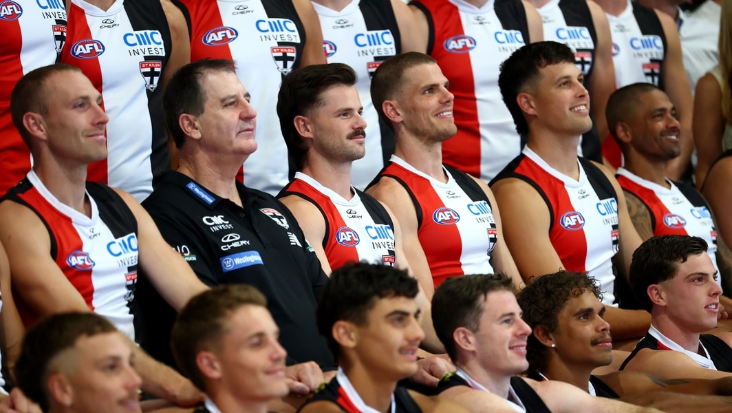 Callum Wilkie, Ross Lyon and Jack Sinclair on St Kilda photo day ahead of the 2026 season. Picture: AFL Photos