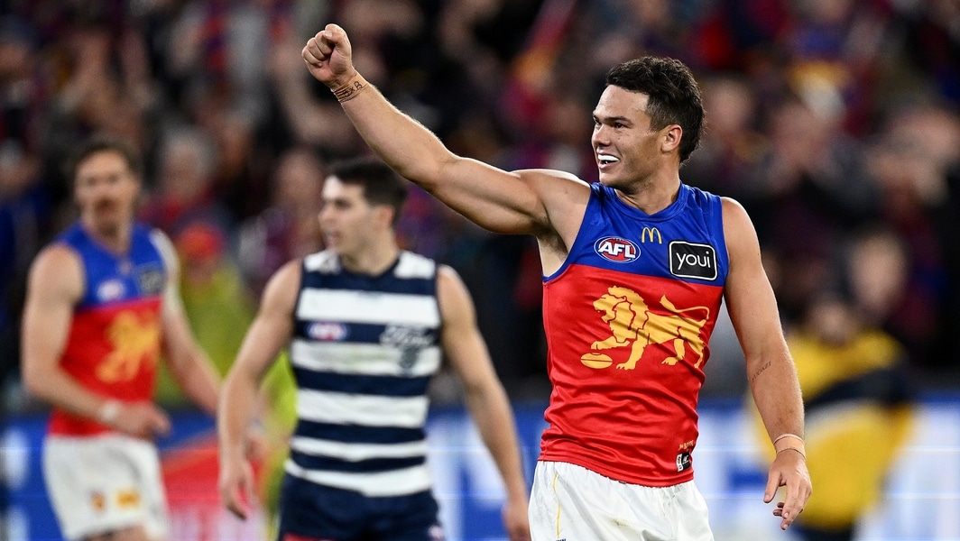 Cam Rayner celebrates a goal during Brisbane’s preliminary final against Geelong on September 21, 2024. Picture: Getty Images