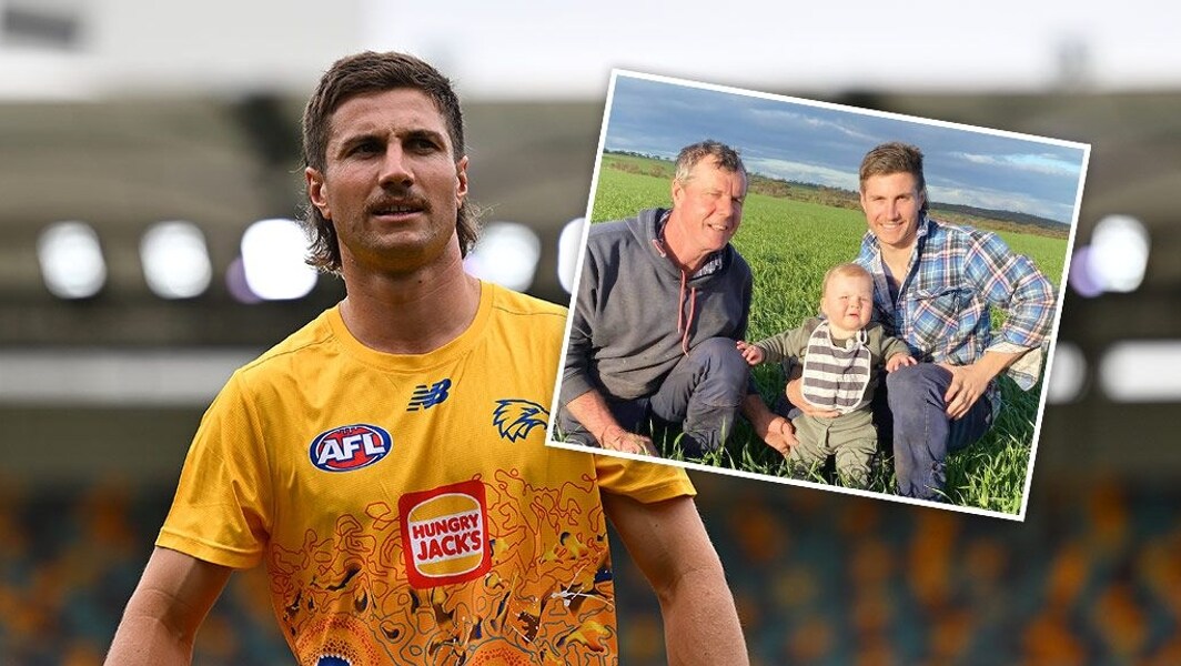Liam Baker ahead of West Coast’s clash with Brisbane in round two, 2025 and (inset) with his father Kim on the family farm in Pingaring, WA. Pictures: AFL Photos / Instagram