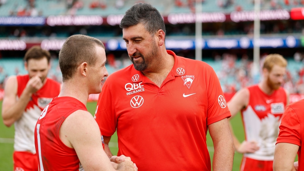 Chad Warner speaks to Dean Cox after Sydney’s clash against Greater Western Sydney in round eight, 2025. Picture: AFL Photos