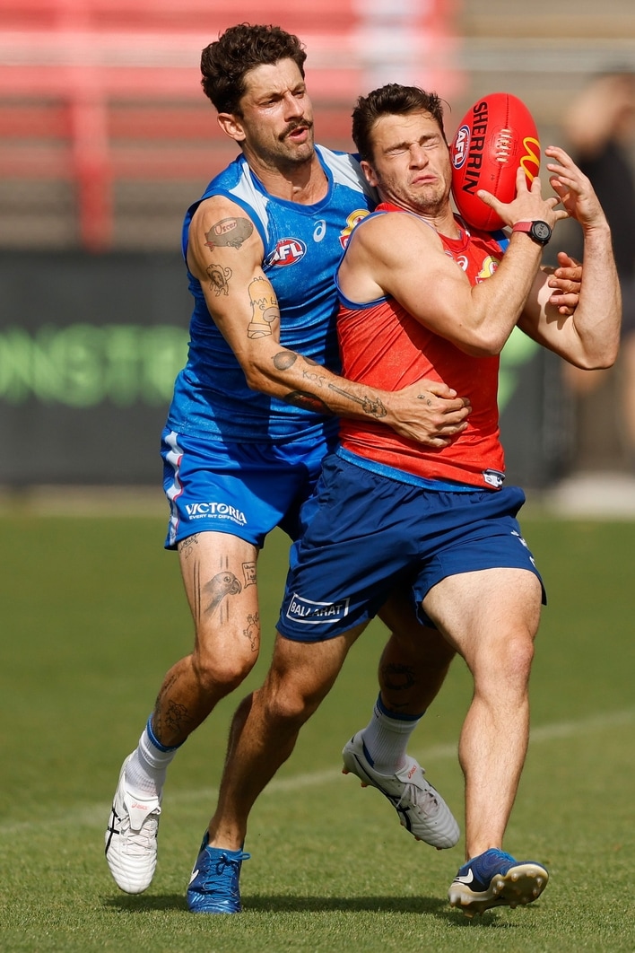 Tom Liberatore tackles Cooper Craig-Peters during the Western Bulldogs’ training session at Whitten Oval on January 16, 2026. Picture: AFL Photos