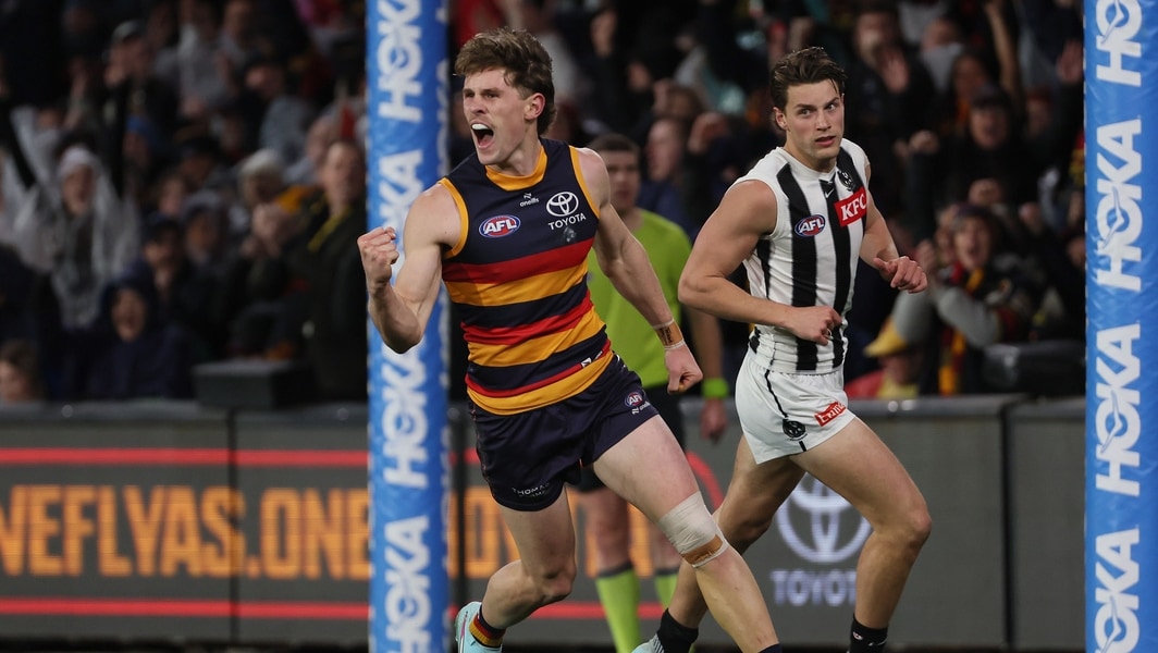Dan Curtin celebrates a goal during Adelaide’s clash against Collingwood in round 23, 2025. Picture: AFL Photos