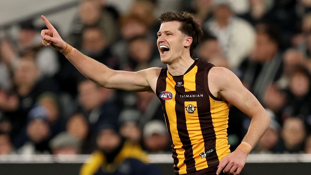 Mitch Lewis celebrates a goal during Hawthorn’s clash against Collingwood in round 22, 2025. Picture: Getty Images